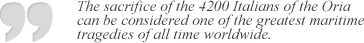 Very few survived: about 50 among Italian and German soldiers. Given the very high human cost, the sinking of the Oria is considered one of the worst naval disasters ever. In spite of its gravity, this tragic incident is to this day still little known. In recent years, thanks to the Internet, relatives of the dead and a few Greeks that took the matter at heart began discussing it. They reconstructed the events and asked the intervention of the Italian authorities in order to compile a thorough report of the events and to make it officially public.